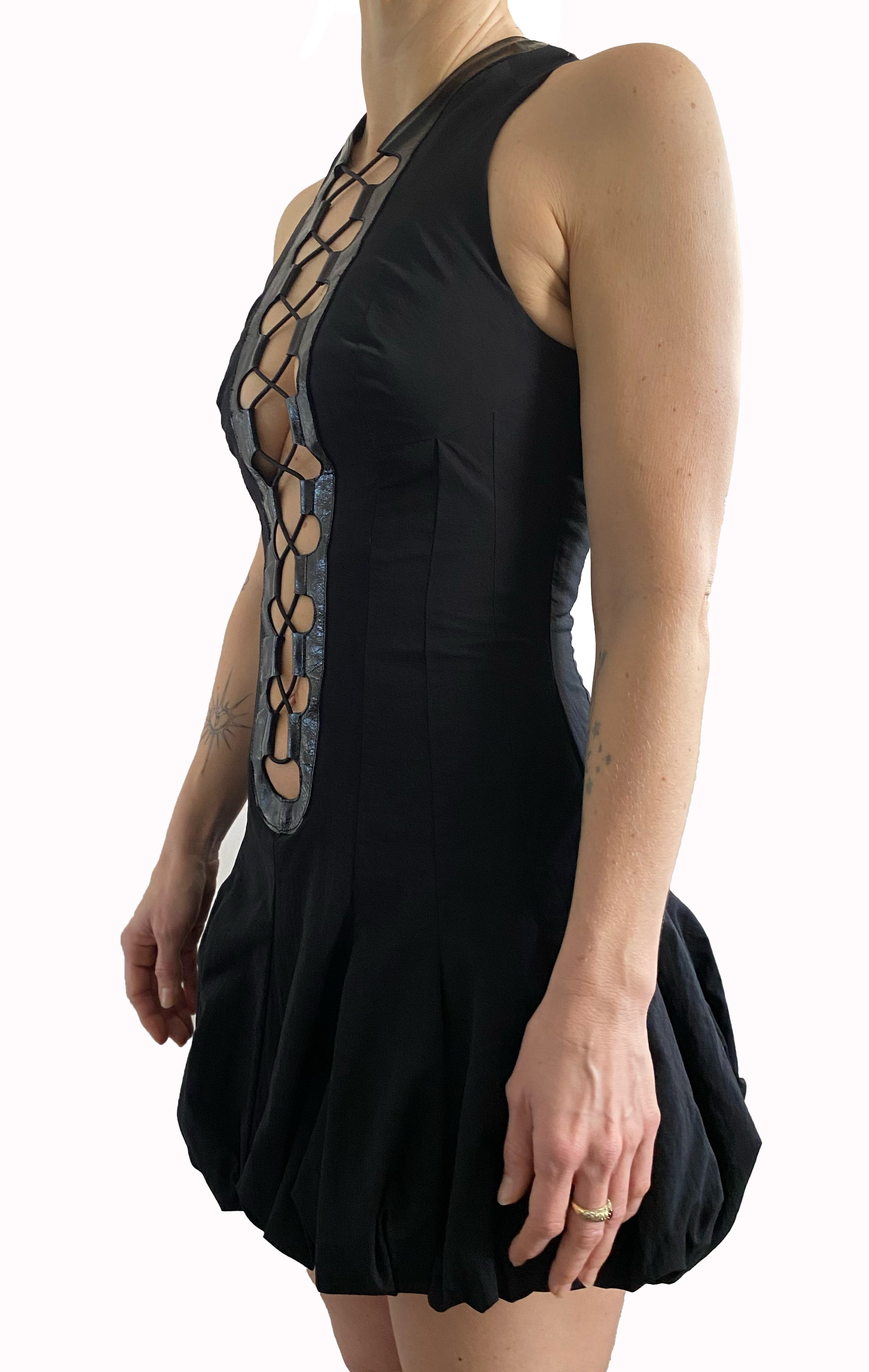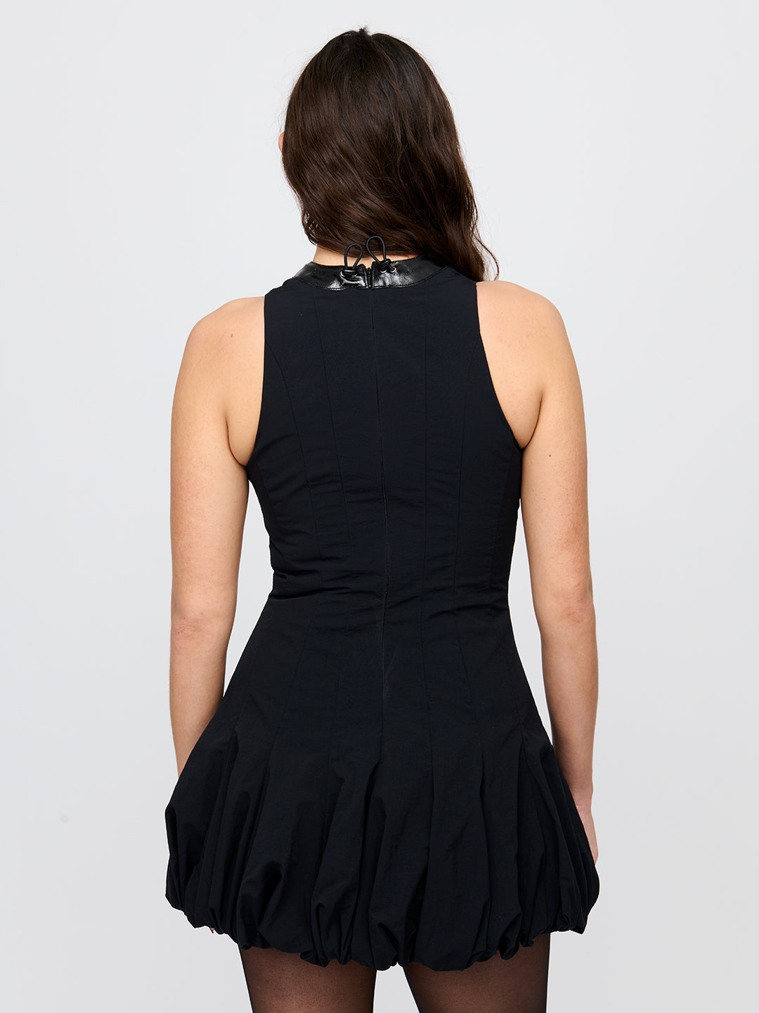 Black multi panelled mini dress with puff ball silhouette starting just below the hips. Size adjustable with elastic interlacing down front and toggle at back neck. Fully lined with invisible zip in back.