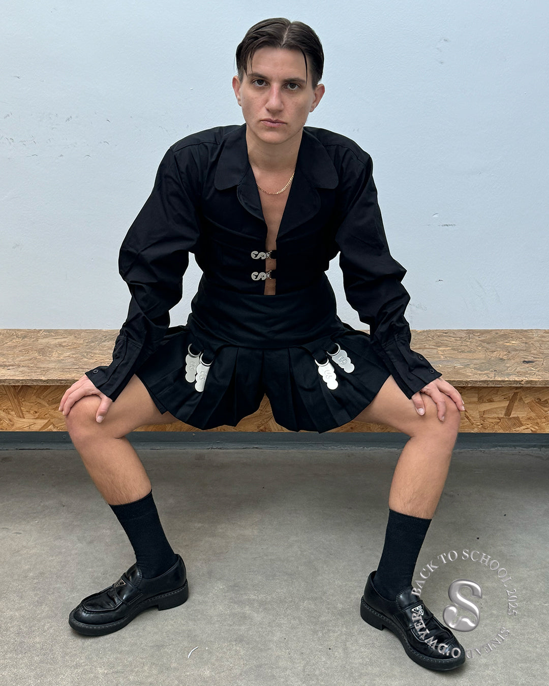 Black pleated mini culottes with zinc alloy double trim belt. Invisible side zip closure and two welt pockets on the back.